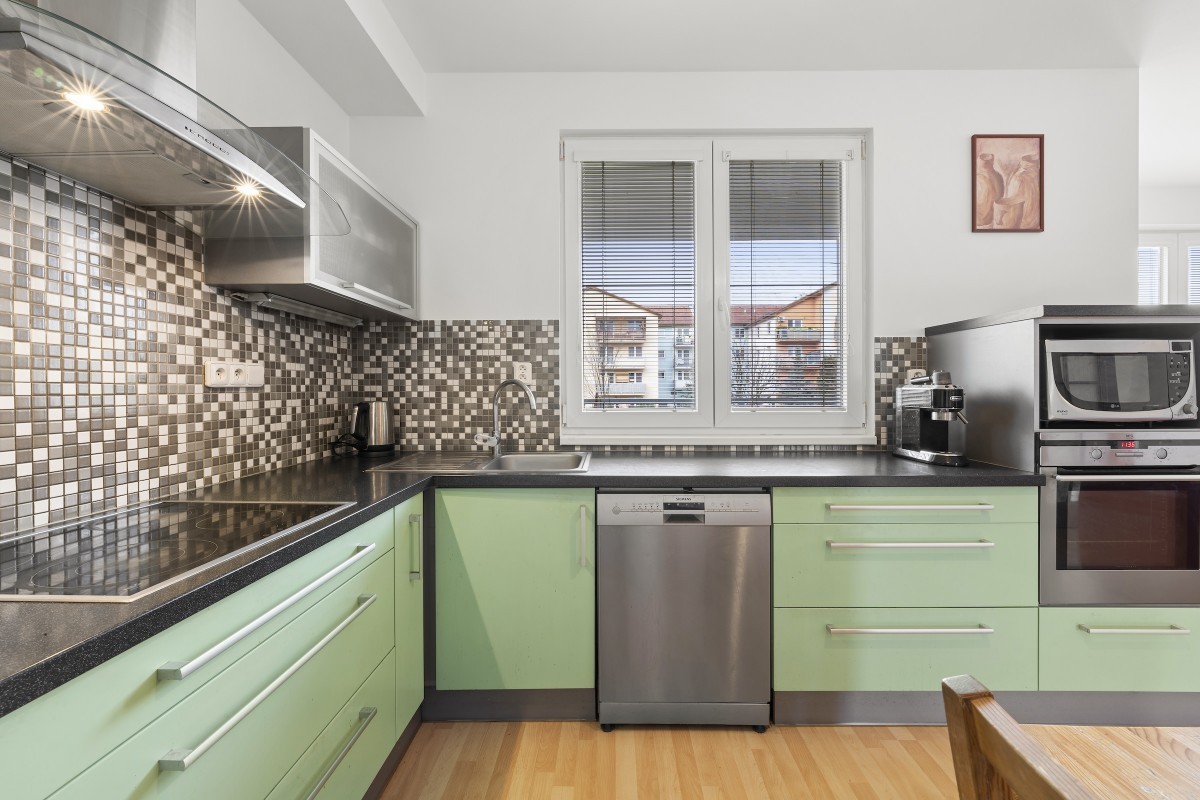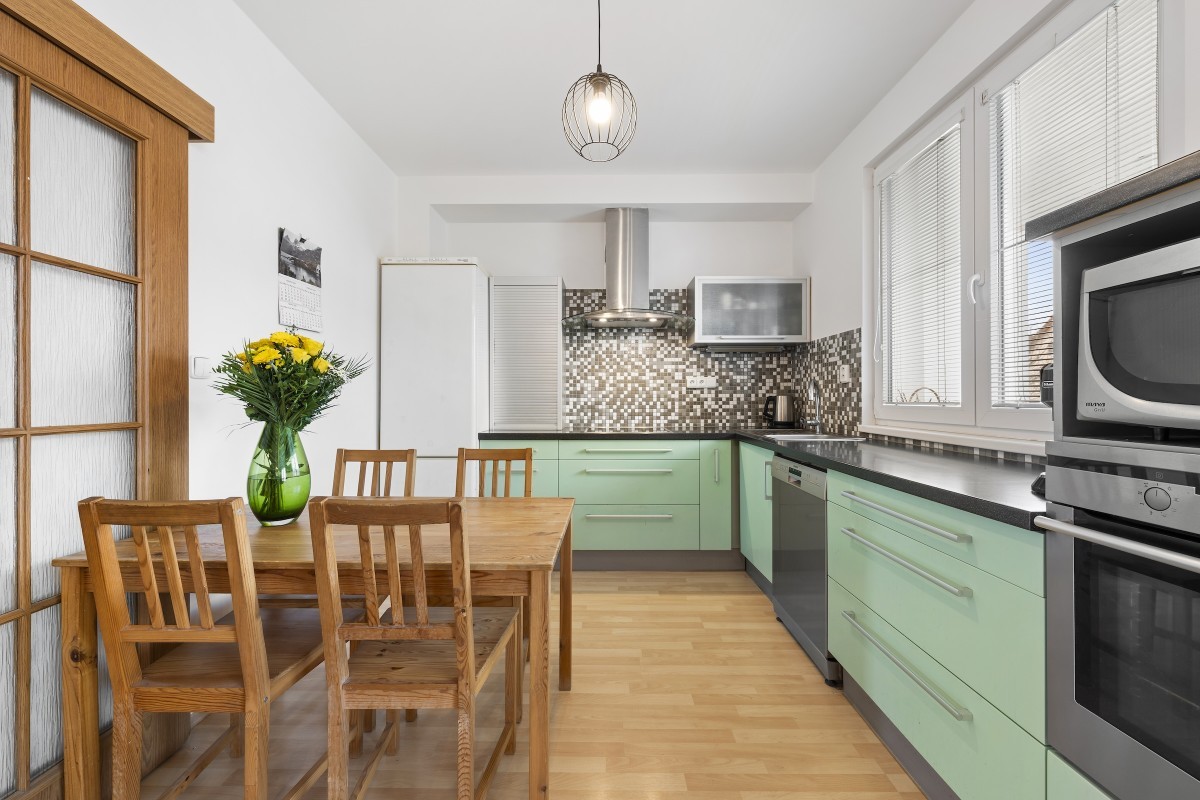 lednice s mrazákem), prostor pro jídelní stůl navazuje na