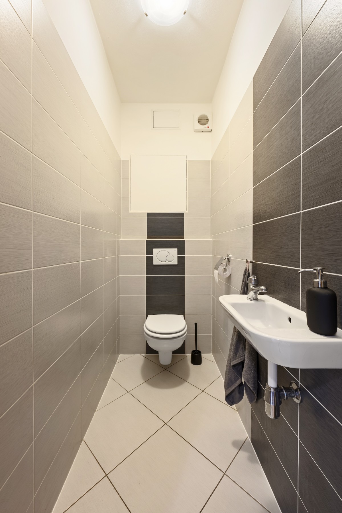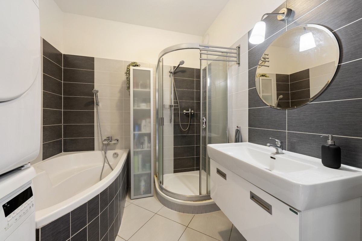 Koupelna je vybavena jak vanou, tak sprchovým koutem a poskytuje dost místa